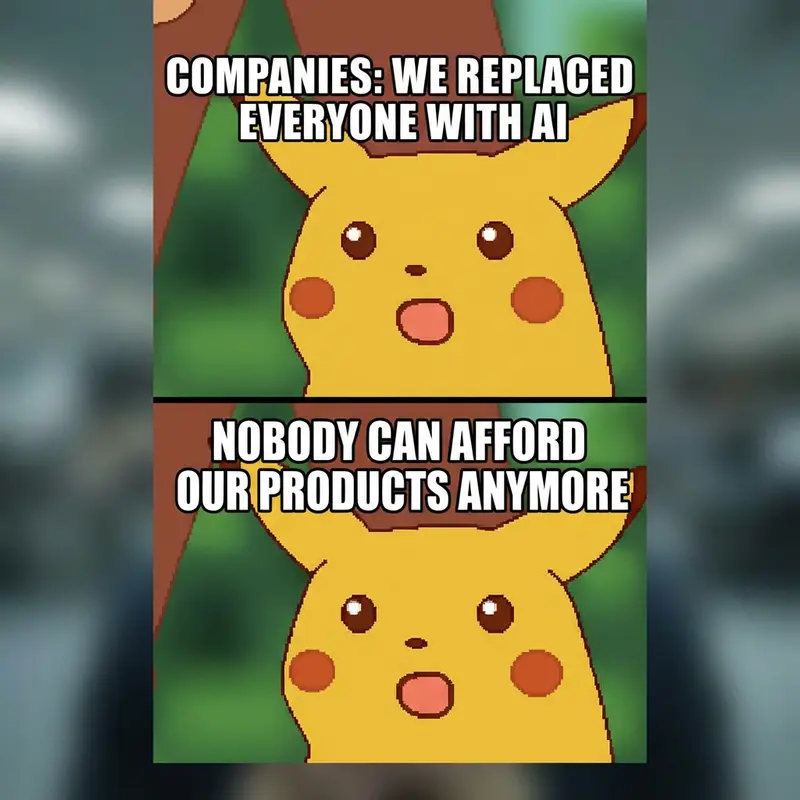 Surprised Pikachu face when AI replaces jobs and nobody can afford products anymore.